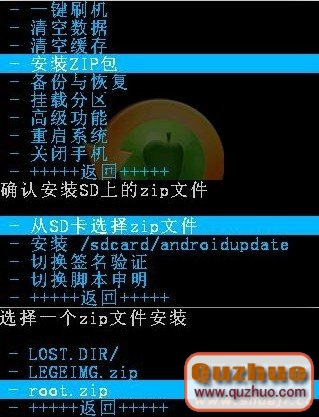 執行“安裝zip包”-從sd卡選擇zip文件-選中root.zip,確認