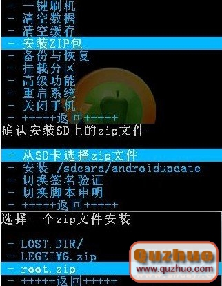 執行安裝zip包-從sd卡選擇zip文件-選中root.zip,確認,等待root完成,