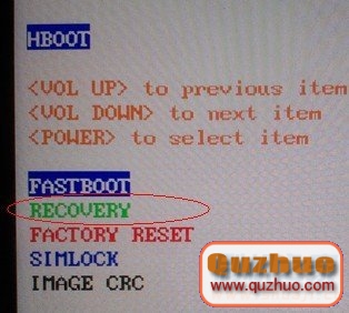 5:接著手機關機,然後按音量下+開機鍵開機,出現hboot界面後按音量鍵選擇recovery,稍等片刻後選Recovery,進入到Recovery程序。