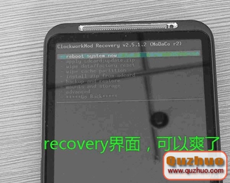 6、先將TF卡裡的PG05IMG.zi刪除,進入recovery,然後同樣方法是進入HBOOT狀態,待檢測後按音鍵加減鍵選擇到第二項“RECOVERY”,用電源鍵確認,會重啟進入recovery