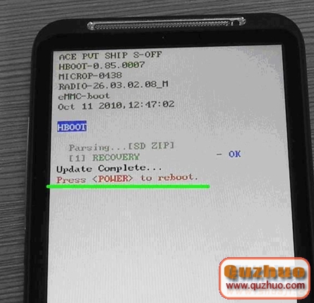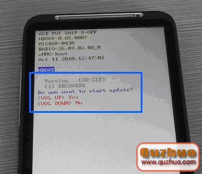 2、刷radio :手機關機,先按住音量下鍵,不放的情況下,再按住電源鍵,此時手機進入HBOOT界面此時不需要操作,等待手機讀取內存卡的PG05IMG文件包,1分鐘左右,會提示您是否更新,顯示為YES OR NO, 按音量上鍵選擇YES 更新就行。更新完後,會提示您,是否重新啟動手機,您按一下電源鍵,手機即便重啟。停在某個畫面請耐心等待