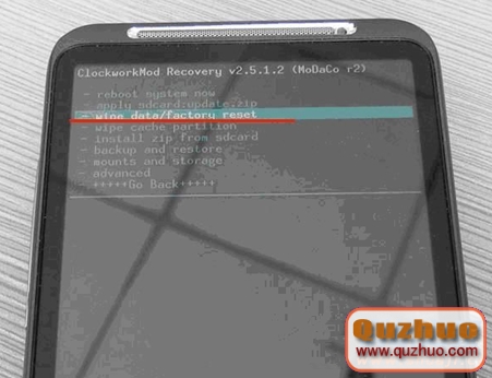 按音量下鍵選到wipe data/factory reset(即第三項),按下小房子,如刷機不進行此步,大多數會出現系統無故重啟