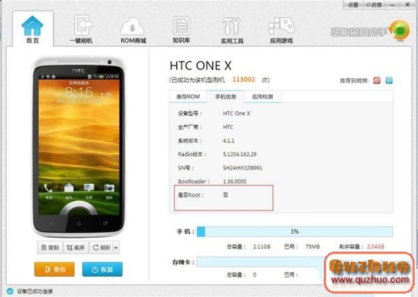 2、通過甜椒刷機助手首頁可以看到手機的信息,手機要刷機就必須先要ROOT,在甜椒首頁上就可以看到手機是否ROOT了。如果手機還沒有ROOT的話,可以點開甜椒“實用工具”,裡面有“一鍵ROOT”功能。
