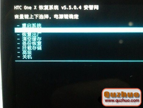 2:接下來就是進入recovery界面:手機先關機,然後按“音量減” 鍵 向下選擇recovery,點擊“電源”鍵 確認選擇。注:此界面下 “音量”鍵 為上下選擇鍵。“電源”鍵為確認鍵