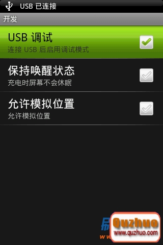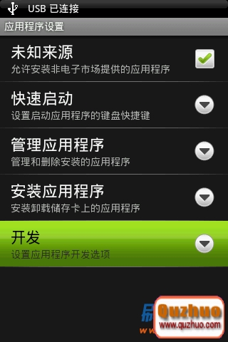 打開手機主菜單,依次點擊 設置 → 應用程序 → 開發,然後勾選“USB調試”選項
