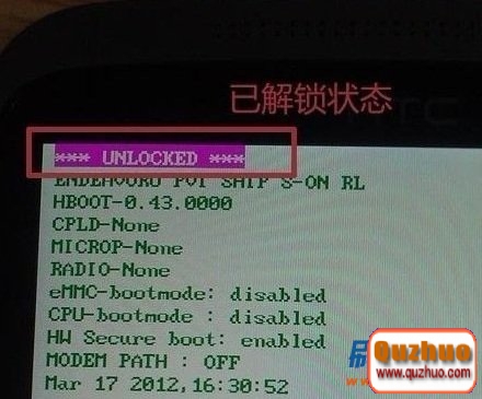 7:手機端操作上圖內容後,即可完成解鎖,進入HBOOT後如下圖,所有步驟完成