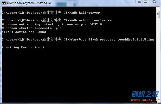 如果出現上面的效果圖中的【 waiting fro device 】的話,說明數據線沒有連接好www.shuleba.com電腦好,仔細再檢查一下