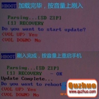 手機關機,同時按住音量下和電源鍵進入hboot模式,手機會自動檢測升級包