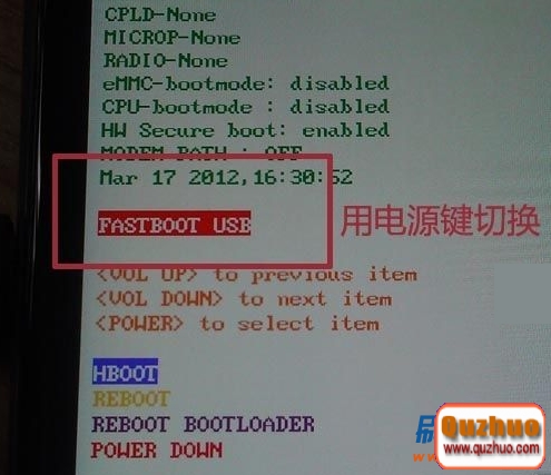 1:手機用usb連接手機和www.shuleba.com電腦,然後手機關機,在關機狀態下按音量減+開機鍵,進入Hboot模式,然後按音量鍵選擇FASTBOOT,按電源原鍵確認進入fastboot模式,開機鍵選擇,顯示fastboot usb,後面的操作都在fastboot usb 狀態下進行