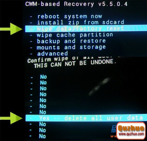wipe data/factory reset(清空所有數據)——Yes——delete all user data(是的-清空所有數據)