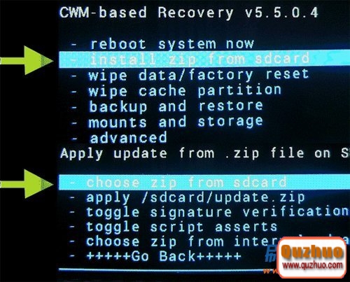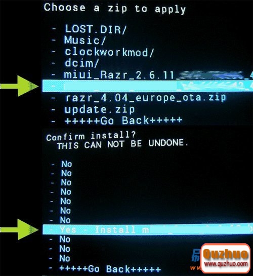 4:接下來就是開始刷入zip格式的刷機包了,按音量鍵選擇install zip from sdcard(從SD卡選擇刷機包),確認,然後再按音量鍵選擇 choose zip from sdcard(從SD卡上選擇zip文件),然後確認,接下來按音量鍵移動光標找到之前放入SD卡根目錄的刷機包,然後選擇Yes – Install XXXXX.zip(是的 - 安裝XXX),按電源鍵開始刷機: