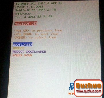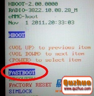 2:同時按住手機的電源鍵和音量鍵“—”同時按住,進入HBOOT模式,選擇Fastboot,電源鍵確定