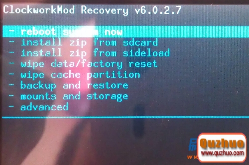如果顯示上面的效果圖(至少要有install zip from sdcard這一項)說明recovery刷入成功了