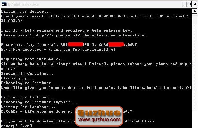 看到SUCCESS了嗎?說明成功了!下面有個Y/N,可以無視!按 Y下載RECOVERY,或者按N就會就退出了,手機自動重啟到HBOOT界面了