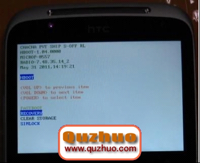 6、進入HBOOT這個界面按一下音量下鍵選擇第二項Recovery按開機鍵確認,手機會重啟進入Recovery如下圖: