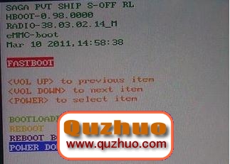 1、在上圖的HBOOT界面,選擇‘’FASTBOOT‘’,按‘’開機鍵‘’確定,會進入到如下圖界面;