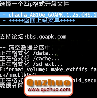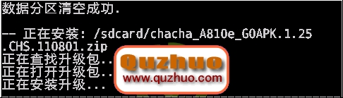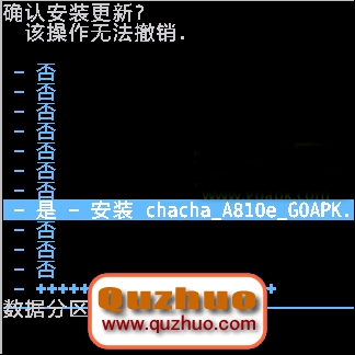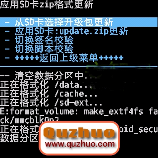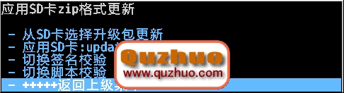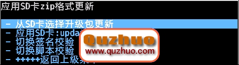 11、選擇 -從SD卡選擇升級包更新(choose zip from sdcard),按電源鍵確認,進入以下界面,如下圖: