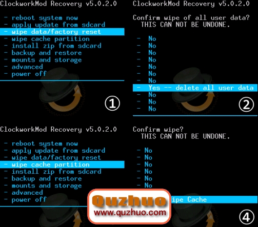 Recoverywipe data/factory rese > Yes-delete all user data