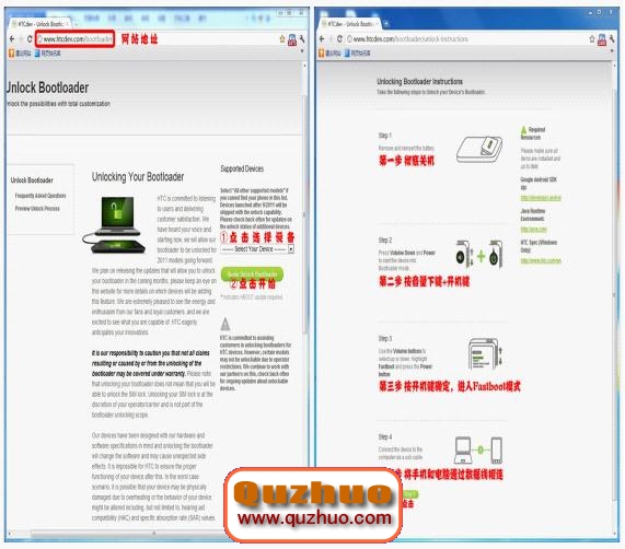 確認完畢後點擊 http://www.htcdev.com/bootloader > 在網站最上方填入用戶名及密碼並點擊 Login 登陸 > 登陸後從下拉框中選擇對應機型,如果沒有則選擇 All Other Supported Models > 點擊下方綠色 Begin Unlock Bootloader > 此時彈出警告框,點擊 Yes > 勾選,點擊 Proceed to Unlock Instruction > 跳轉至官方教程 > 手機關機,再按"音量下鍵+開機鍵" > 進入Bootloader模式,並且按開機鍵確定,進入Fastboot模式 > 進入後使用數據線將手機與www.shuleba.com電腦連接