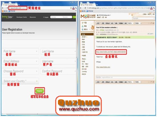 點擊 http://www.htcdev.com/register / 填寫相關注冊訊息 > 填寫完畢點擊Register > 進入所填寫郵箱查看HTC郵件,並點擊確認
