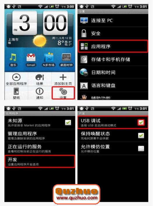 確保“USB調試”處於打開狀態:“設置” > “應用程序” > “開發” > 勾選“USB調試”。