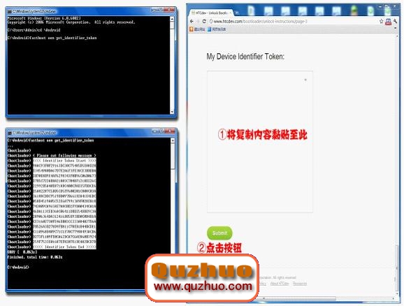 www.shuleba.com電腦端解壓一鍵工具 > 雙擊token.bat > 復制圖中所示內容(右擊 > 標記 > 選取內容 > 復制) > 將復制內容黏貼至http://www.htcdev.com/bootloader/unlock-instructions/page-3最下方空白處,並點擊 Submit按鈕提交 > 提交後打開郵箱,查看HTC郵件,下載郵件中附件 Unlock_code.bin -> 將下載文件放入一鍵工具文件夾 > 雙擊運行 unlock.bat