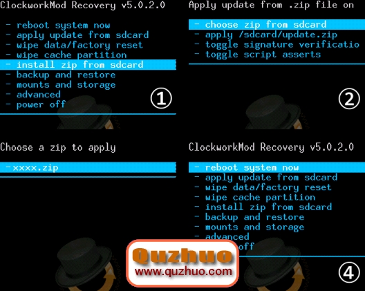 install zip from sdcard > choose zip from sdcard > xxxxx.zip > Yes-install > 耐心等待幾分鐘 > 完成後,點擊返回鍵,選擇reboot system now手機自動重啟