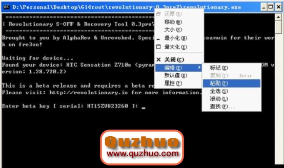 5、復制第三步得到的bety key ,在窗口上方點右鍵,編輯-粘貼,然後回車!耐心等待,正在解 鎖……