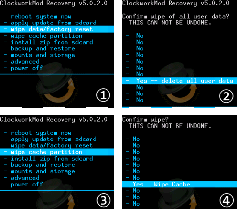 選擇 wipe data/factory reset→選擇 Yes—delete all user data