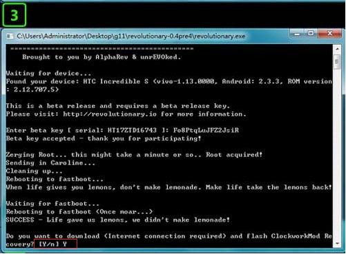 然後輸入STEP1中得到的序列號,回車確認,等待即可,然後會詢問是否安裝recovery,輸入Y確認即可,完成之後會選擇BOOTLOADER——RECOVERY進入Recovery。(音量鍵選擇,電源鍵確認)