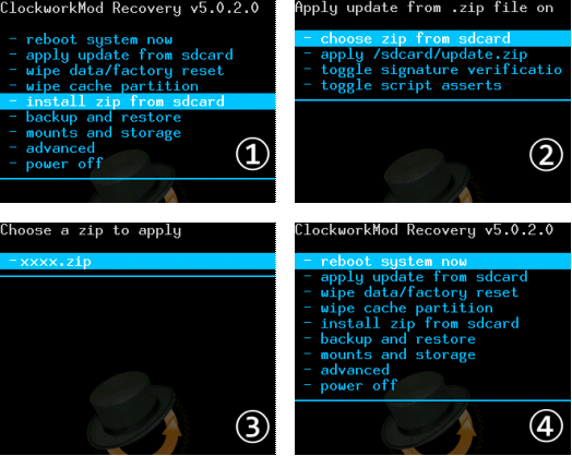 install zip from sdcard > choose zip from sdcard > xxxxx.zip > Yes-install > 耐心等待幾分鐘 > 完成後,點擊返回鍵,選擇reboot system now手機自動重啟