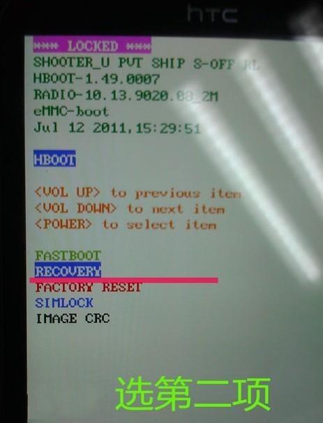 3、進入recovery,在HBOOT狀態下通過音量鍵移動光標到第二項(recovery),電源鍵確定。