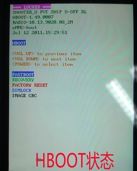 2、進入HBOOT,長按音量減少鍵和電源鍵進入HBOOT狀態。