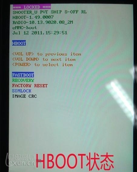 然後按住音量鍵下+開機鍵開機,手機會進入HBOOT