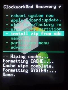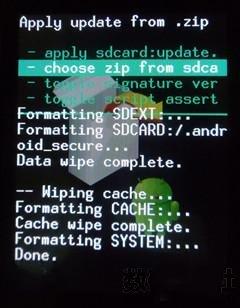 4、手機進入RECOVERY界面,在recovery界面,選第五項install zip from sdcard 按軌跡球確定,然後再選第二項 choose zip from sdcard按軌跡球確定,然後選擇radio包文件 按軌跡球確定,再選yes按軌跡球確定開始刷。
