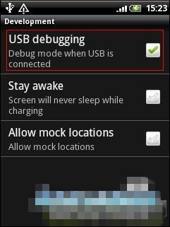 2.1、手機開機進入系統,勾選USB調試模式(中文:按Menu鍵->設置->應用程序->開發->USB調試,英文:按Menu鍵->Settings->Applications->Development->USB debugging),見下圖。