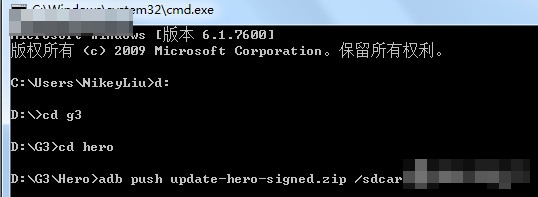 5、windows系統輸入:“adb push update-hero-signed.zip /sdcard/update.zip”