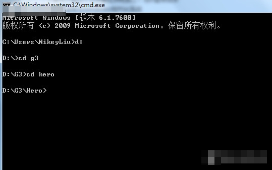 2、用命令提示符或者終端打開到解壓目錄,如我用windows7系統,解壓到D盤根目錄則是
