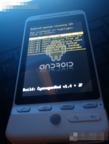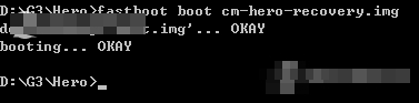 7、windows系統:輸入”fastboot boot cm-hero-recovery.img' 系統將運行新的recovery