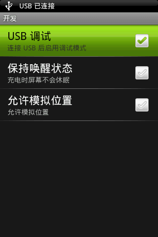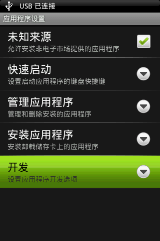1、開啟USB調試。打開手機主菜單,依次點擊 設置 → 應用程序 → 開發,然後勾選“USB調試”選項