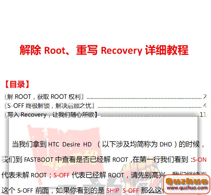 准備工作 判斷手機解鎖狀態(可參考此處www.quzhuo.com/article/html/5948.html) 此教程提供的包僅適用於s-off機型,s-on機型(同