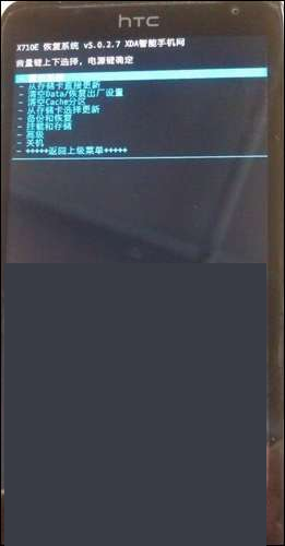 2、按住【音量減】和【電源】進入HBOOT界面,選擇recovery選擇,【電源鍵】進入,隨後便進入中文recovery界面了。