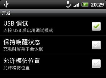 1、首先在手機設置(Settings) -> 應用程序(Applications) -> 開發(Development) 中,把手機的USB 調試(USB debugging) 功能打開,如圖