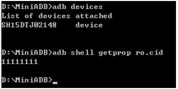 4、之後輸入 adb shell getprop ro.cid 來查看手機的 CID,獲得 HTC XXX(XXX 代表你手機的 CID),我的是 Super CID,顯示 11111111,如圖