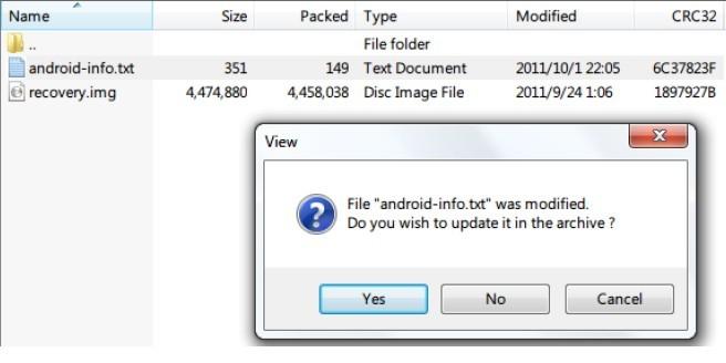 6、之後會提示 android-info.txt 已被修改,需要更新至壓縮包,選確定,如圖