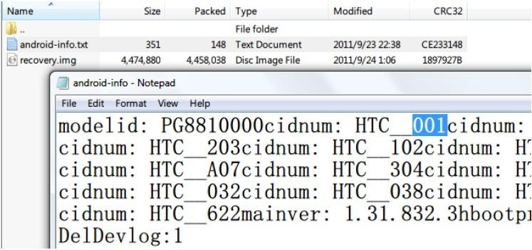 5、記住你的 CID,雙擊 Recovery 的壓縮包(PG88IMG.zip),找到並打開 android-info.txt,修改第一 個 CIDNUM 後面的 HTC__XXX 為你的 CID 號,保存退出,如圖