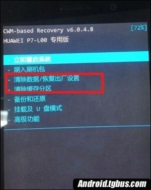 2、進行雙清,即清除數據/恢復出廠設置和清除緩存分區。(音量鍵上下選擇,電源鍵確定)。