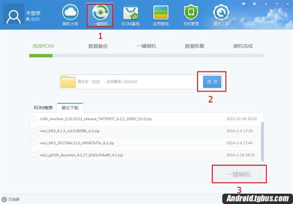 5准備好ROM,我們就可以開始一鍵刷機了。點擊“浏覽”選中剛才下載好的ROM,別忘了按照提示備份好聯系人、短信和應用哦。