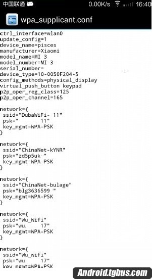 3.最後我們再在wifi目錄裡找到wpa_supplicant.conf文件,然後使用文本查看器打開查看,在這裡變即可查看到所有之前我們手機連接過的Wifi密碼,如下圖所示: