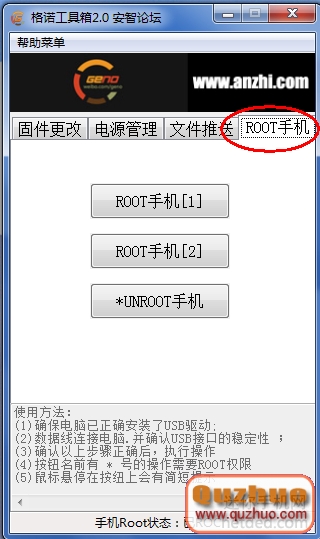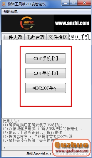 4:然後點擊軟件上的第四個選項卡“root手機”,假如沒有ROOT權限,東西供給了3種辦法進行ROOT,1和2適合於4.1,4.0的體系,3適合於2.3的體系